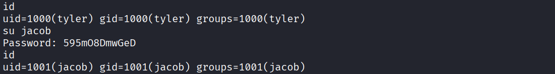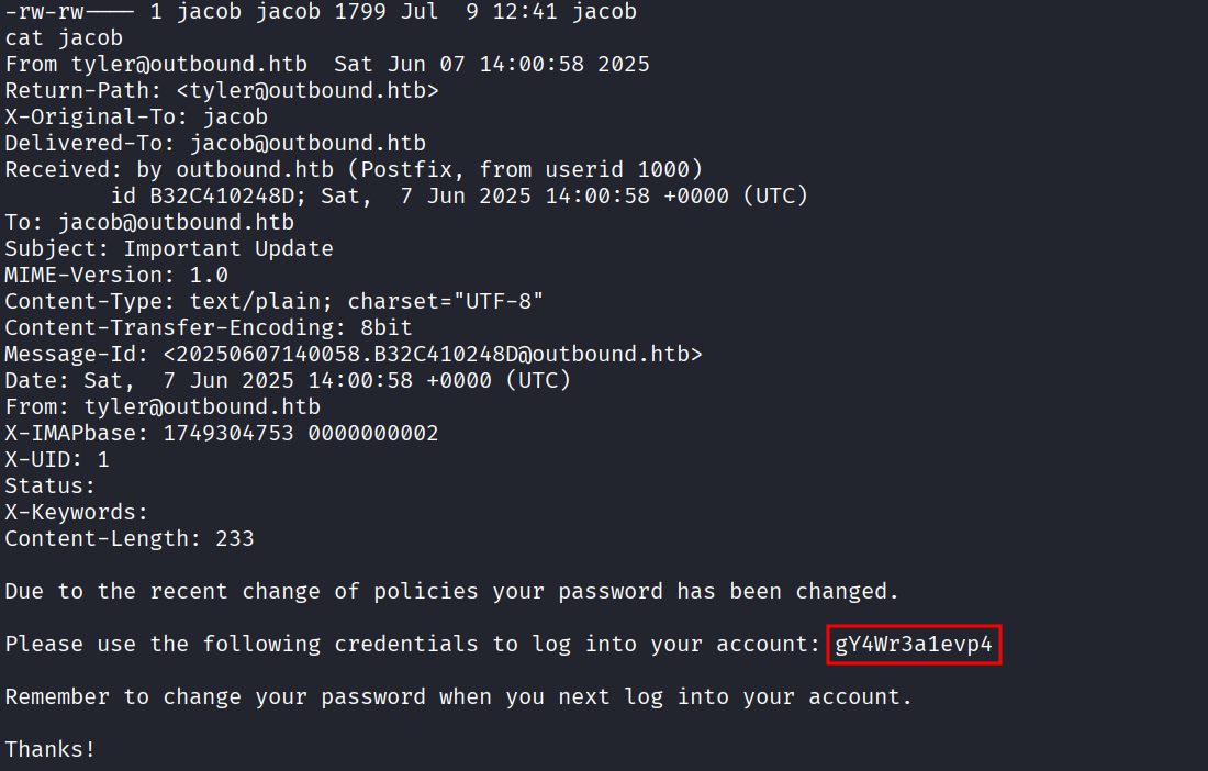 jacob : gY4Wr3a1evp4ssh jacob@outbound.htbLast login: Thu Jul 10 11:44:49 2025 from 10.10.14.77