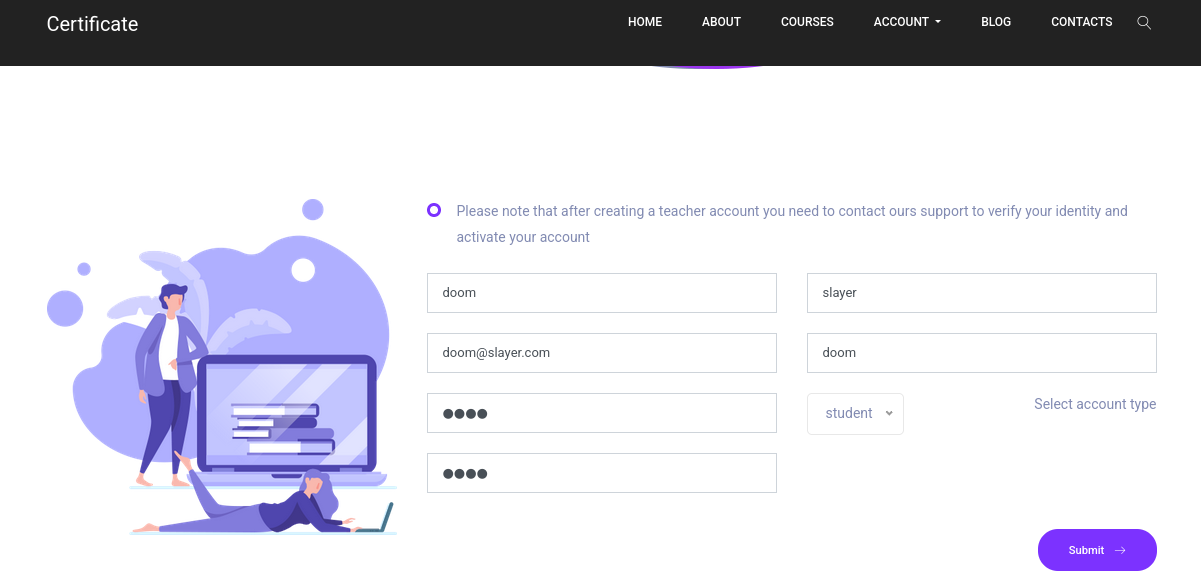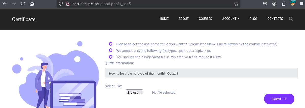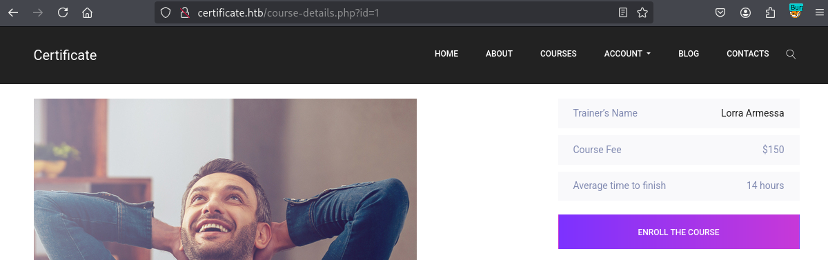 echo '10.129.250.153 certificate.htb dc01.certificate.htb' >> /etc/hostsEl servidor cuenta con un puerto web. La aplicación a simple vista solo tiene un formulario de registro y de inicio de sesión, también cuenta con un formulario de contacto, pero parece no ser relevante. Nos creamos una cuenta para acceder.