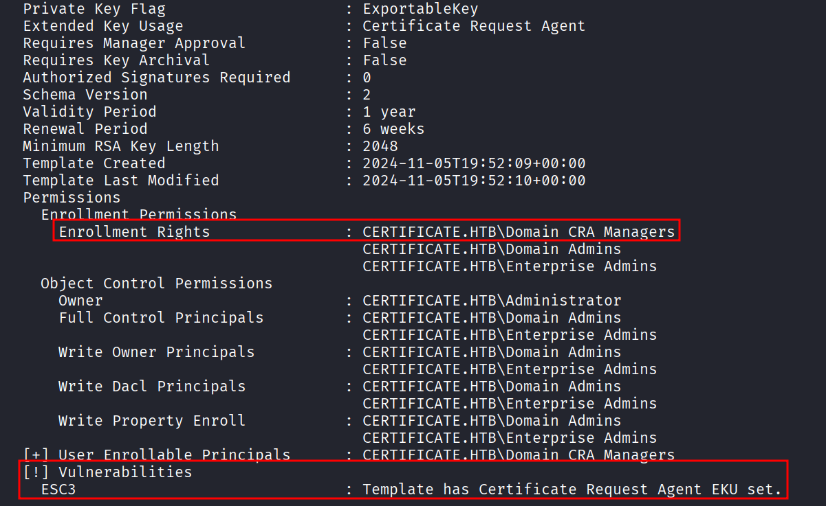 [*] Wrote JSON output to '20250606021545_Certipy.json'Vemos que hay un certificado vulnerable y los usuarios que pertenecen al grupo Domain CRA Managers tienes permisos Enrollment Rights.