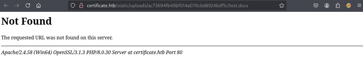 http://certificate.htb/static/uploads/ac73694fb49bf014a070cbd8924bdf5c/nc.phpServing HTTP on 0.0.0.0 port 80 (http://0.0.0.0:80/) ...