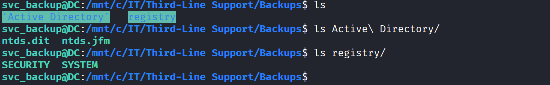 scp -P 2222 -i id_rsa svc_backup@10.10.11.76:'/mnt/c/IT/Third-Line Support/Backups/Active Directory/ntds.dit' .